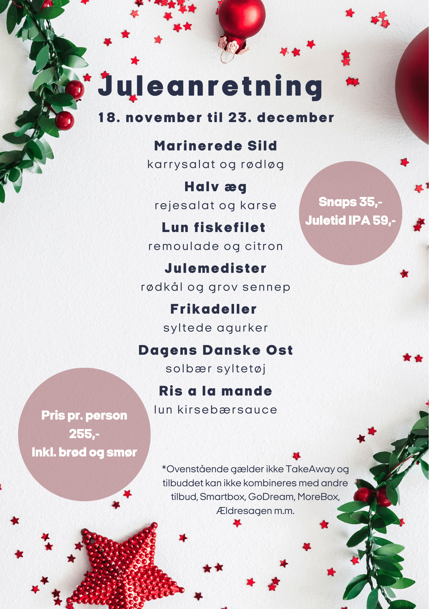 Book bord Se menu Takeaway Julemenu Køb gavekort Hvid Julegløgg & Æbleskiver Hvid julegløgg & lune æbleskiver hos Mauritz Mauritz er kommet i ægte julestemning, og vi forkæler dig med hvid julegløgg og æbleskiver, den perfekte julehygge! Kom og oplev julestemningen på Mauritz … hyggelige, varme omgivelser, duften af jul og masser af god stemning. Vi glæder os til at se dig Mauritz Juleanretning Juleanretning – kun 255,- pr. person Introtilbud: Bestil nu via linket og få den til kun 200,-! De første 200 bestillinger får rabatten, så skynd dig! Serveres i perioden 18. november – 23. december Bestil her